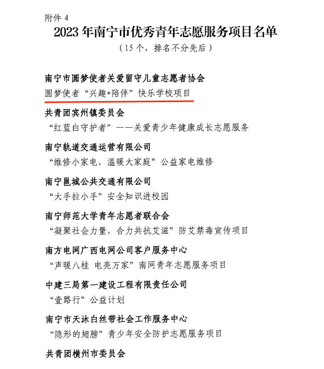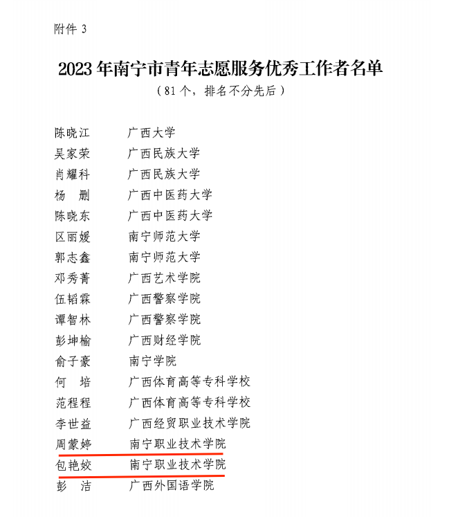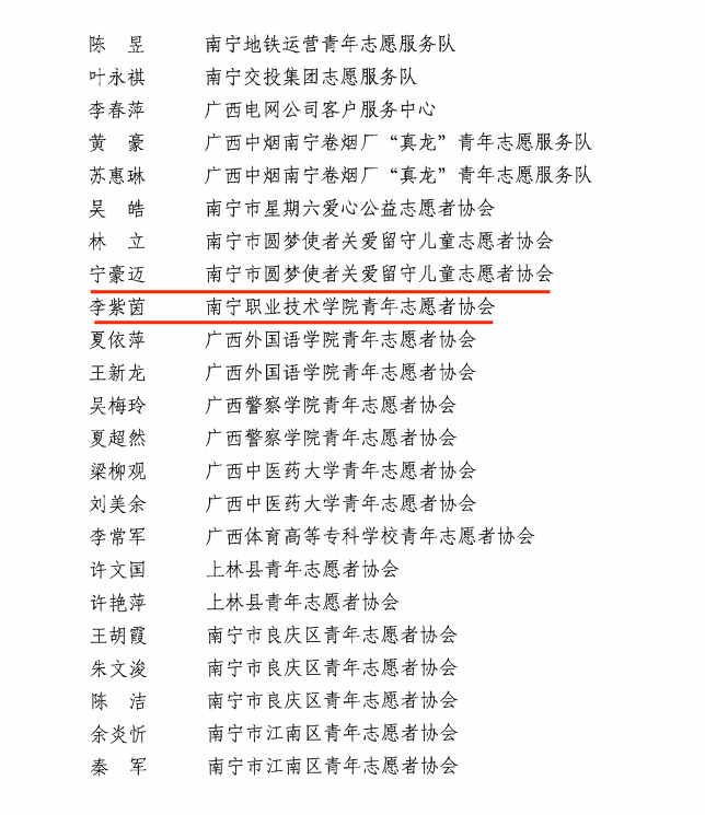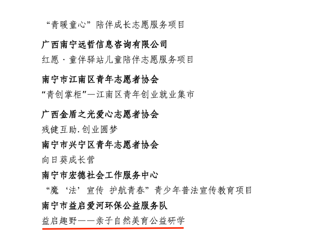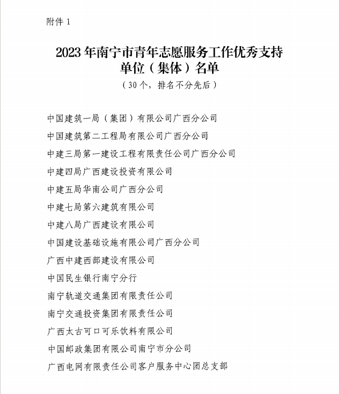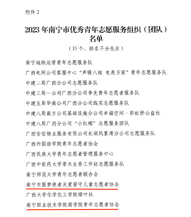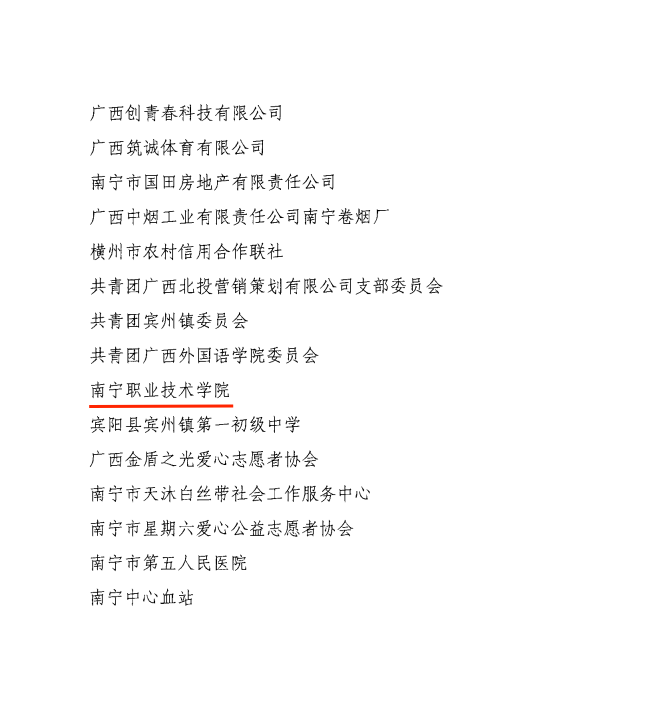 近日,南宁市青年志愿者协会发布《关于表扬2023年南宁市青年志愿服务工作优秀支持单位(集体)、南宁市优秀青年志愿服务组织(团队)、南宁市青年志愿服务优秀工作者、南宁市优秀青年志愿服务项目、南宁市优秀青年志愿者实训岗位的通报》,表扬一批为南宁市青年志愿服务工作的顺利开展作出了积极贡献的优秀支持单位(集体)、组织(团队)、项目和个人。