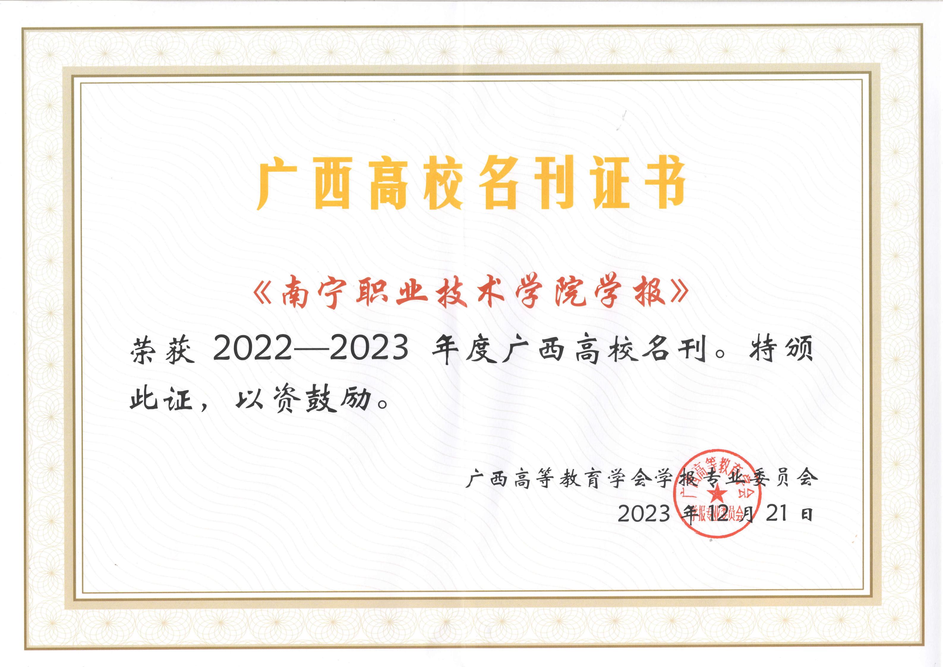学报荣获2022—2023年度广西高校名刊证书