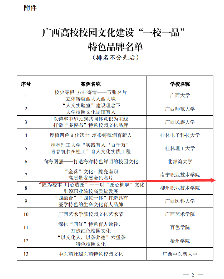 近日,根据《自治区党委教育工委办公室关于公布广西高校校园文化建设“一校一品”特色品牌的通知》(桂教工委办〔2023〕186号),必赢官网《“金葵”文化:擦亮南职高质量发展金色名片》项目入选广西高校校园文化建设“一校一品”特色品牌。