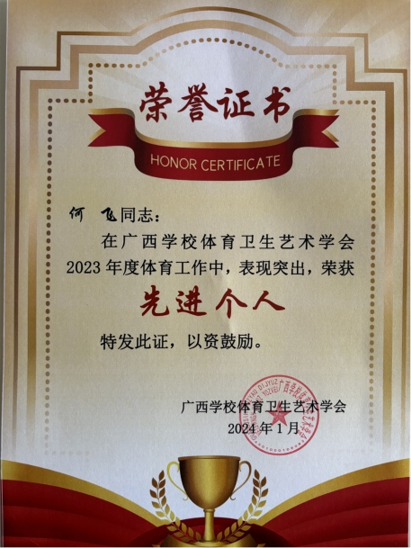 1月12日,广西学校体育卫生艺术学会2023年年会暨2024年工作会议在北海市召开,会议全面总结了2023年各项工作,对在2023年度体育工作中作出突出贡献的单位和个人进行了表彰。必赢官网荣获“2023年度体育工作突出贡献奖”,人文教育学院教师何飞荣获“2023年度体育工作先进个人”称号。