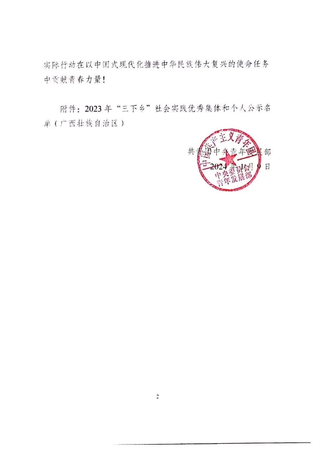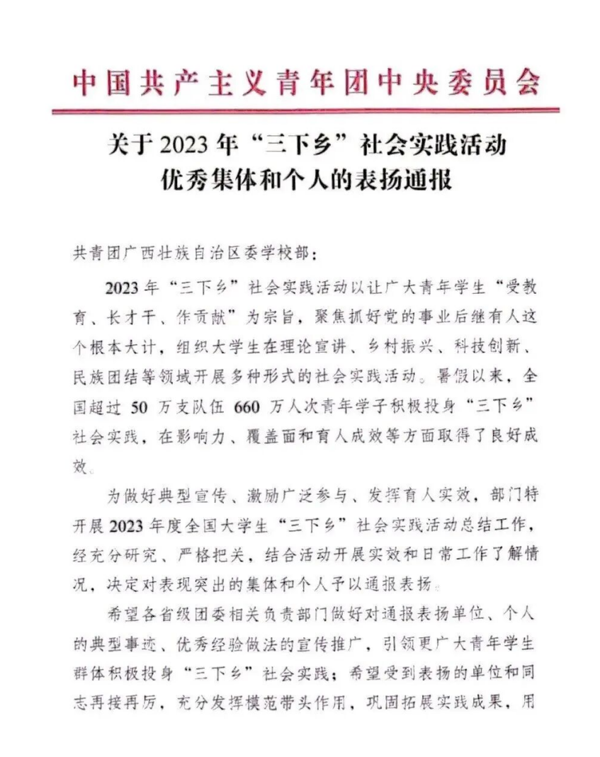 共青团中央《关于2023年“三下乡”社会实践活动优秀集体和个人的表扬通报》文件截图