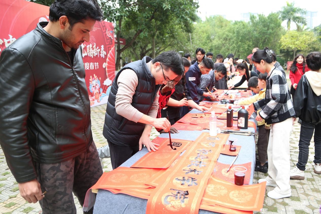 活动现场,黄春波代表学校向留学生们致以新春美好祝福,并为留学生们送上慰问大礼包。随后,留学生们在老师的带领下,纷纷体验制作新春香囊、舞龙花灯,写福字、写春联,切身感受中国传统文化,体会中国文化的别样魅力,现场洋溢着喜悦的中国年味。来自印度尼西亚的关美雪用一口流利的普通话说道:“通过这次活动,我对春节和中国传统文化多了一份了解,我会把今天活动的视频发给我的家人,让他们看看中国的年味,也让他们放心,我在中国这个‘家’生活的非常开心。”