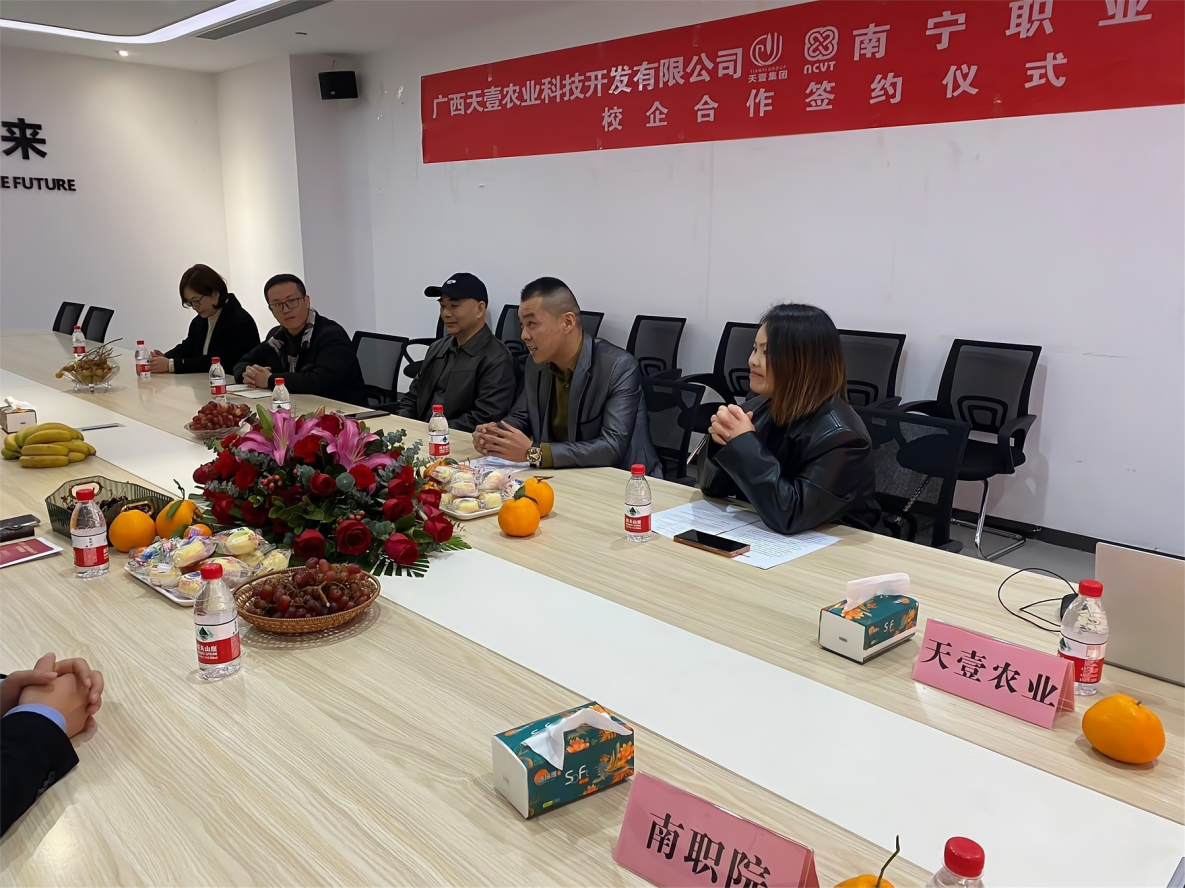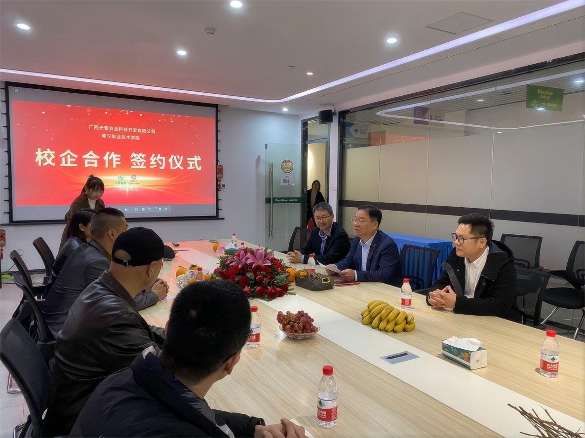 刘荣在致辞中表示,广西天壹农业科技开发有限公司以乡村振兴全产业链服务为主业,以带动退伍军人创业就业为独特的优势和发展导向,值此产业园建设初见规模,主营业务蒸蒸日上之际,愿与南宁职业技术学院深化合作,政军企校合作共建创新性乡村振兴企业,为实现“利国利民、利政利己”的乡村振兴产业目标提供更大的智力支持和人才支撑。