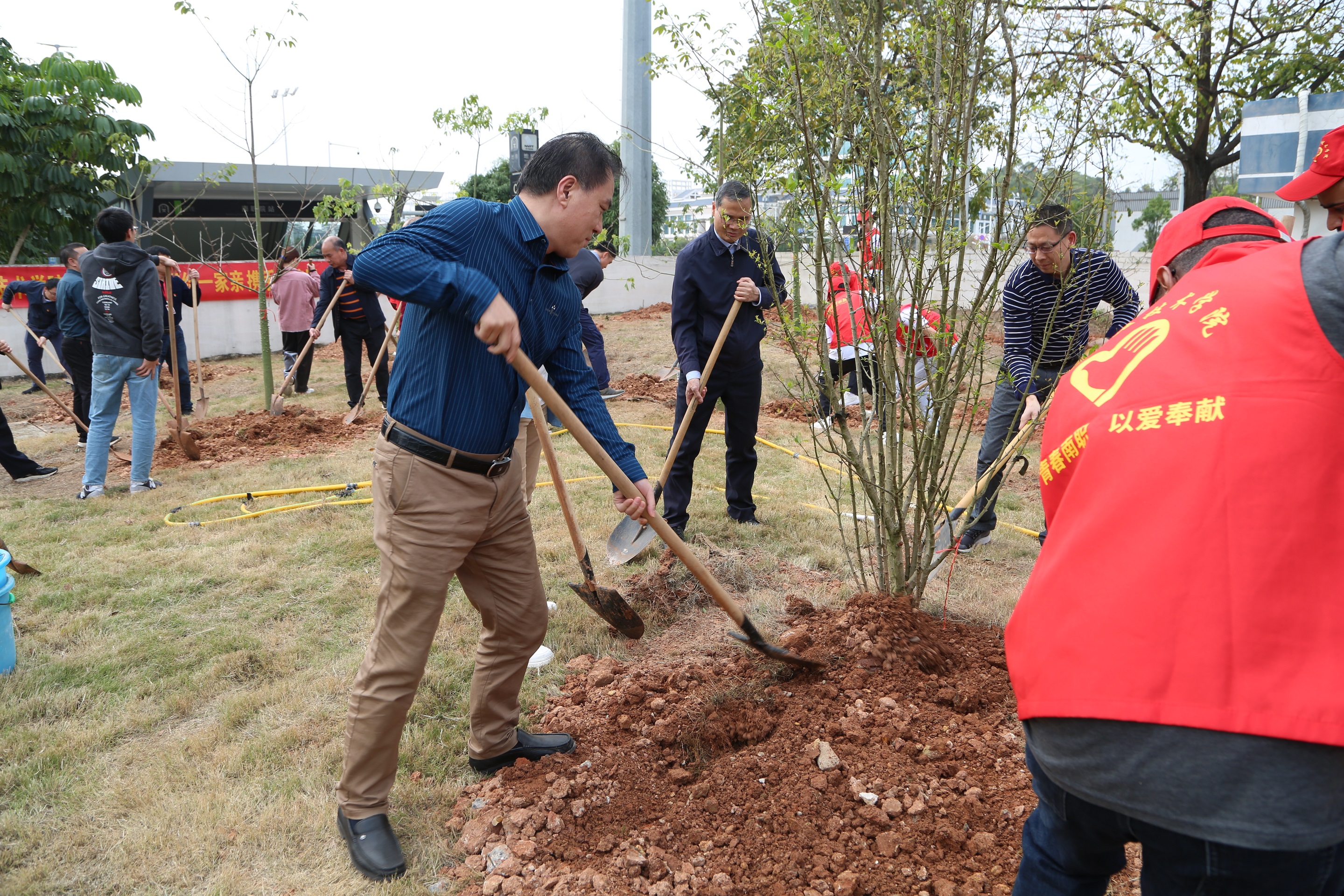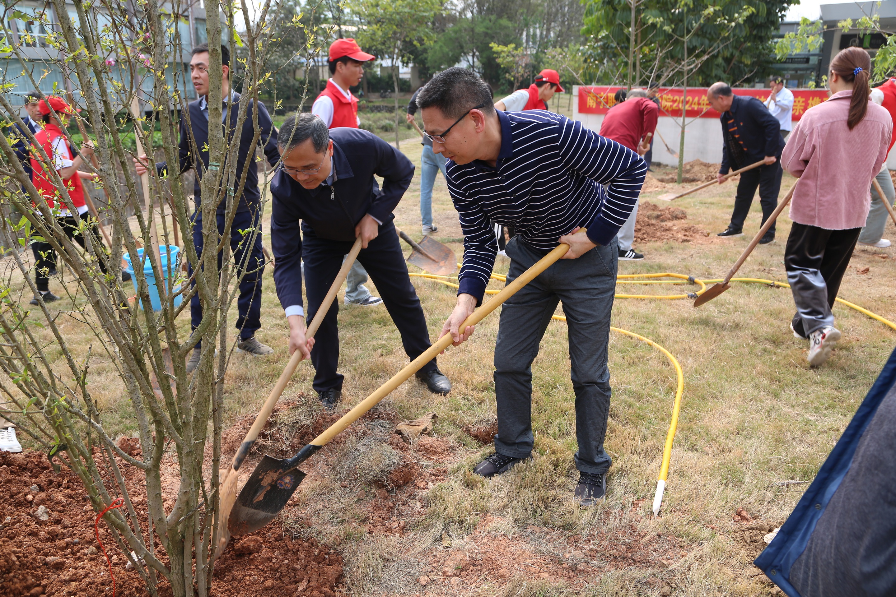 校领导和志愿者们在为树苗培土(南职融媒陆鹏宇/摄)