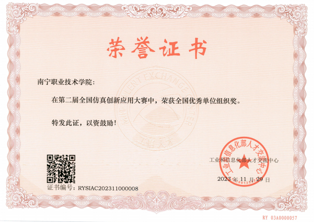 近日,2024年全国仿真创新应用大赛启动会在西北工业大学举行,在本次会议上组委会向2023年度的获奖者颁发了仿真科学创新奖、全国仿真技术应用成果奖以及全国优秀单位组织奖,表彰他们在仿真科学技术领域的卓越贡献。全国共有清华大学、浙江大学、四川大学、深圳职业技术大学、陕西铁路工程职业技术学院等18所本专科院校获得优秀单位组织奖。必赢官网作为全国两所广西唯一职业院校代表喜获2023年度全国仿真创新应用大赛优秀单位组织奖。在2023年全国仿真创新应用大赛中,必赢官网共荣获3个国赛二等奖、4个国赛三等奖。