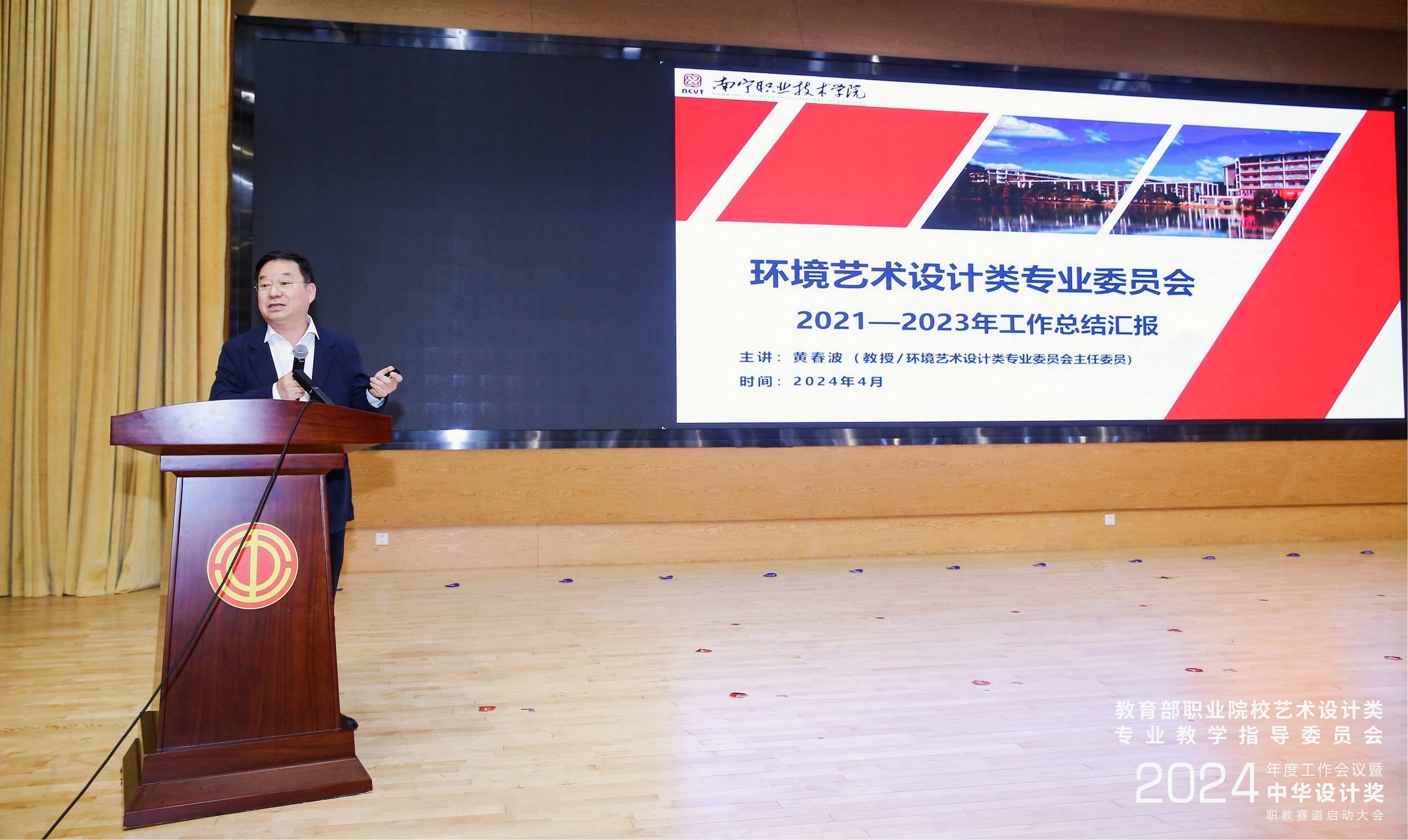 黄春波的工作汇报分为两个部分,第一部分为2023年度工作总结:围绕服务美丽中国建设,为全国职业院校环境艺术类专业建设提供指导服务的目标,分别从专业标准制(修)订、新一届组织机构组建、专业建设、课程建设、教材开发、教师发展、产教对话、赛教融合等八个方面介绍了环艺专委会一年的工作成果;第二部分为2024年度工作计划:在去年的工作基础上将继续携手国家行业协会(中国室内装饰协会等)加深联动,深化产教融合校企合作及资源整合,服务成员单位专业高质量建设发展;搭建新形态“规划”教材开发平台,助力成员单位开发系列化新形态教材;举办相关主题(全国乡村振兴设计大赛)毕业设计作品大赛,并推荐参加全国职业院校艺术设计类优秀作品展览,深化产教融合对话改革工作;开展国际交流合作,参加中华杯职教赛道比赛。其工作汇报获得了与会代表及嘉宾的高度认可。