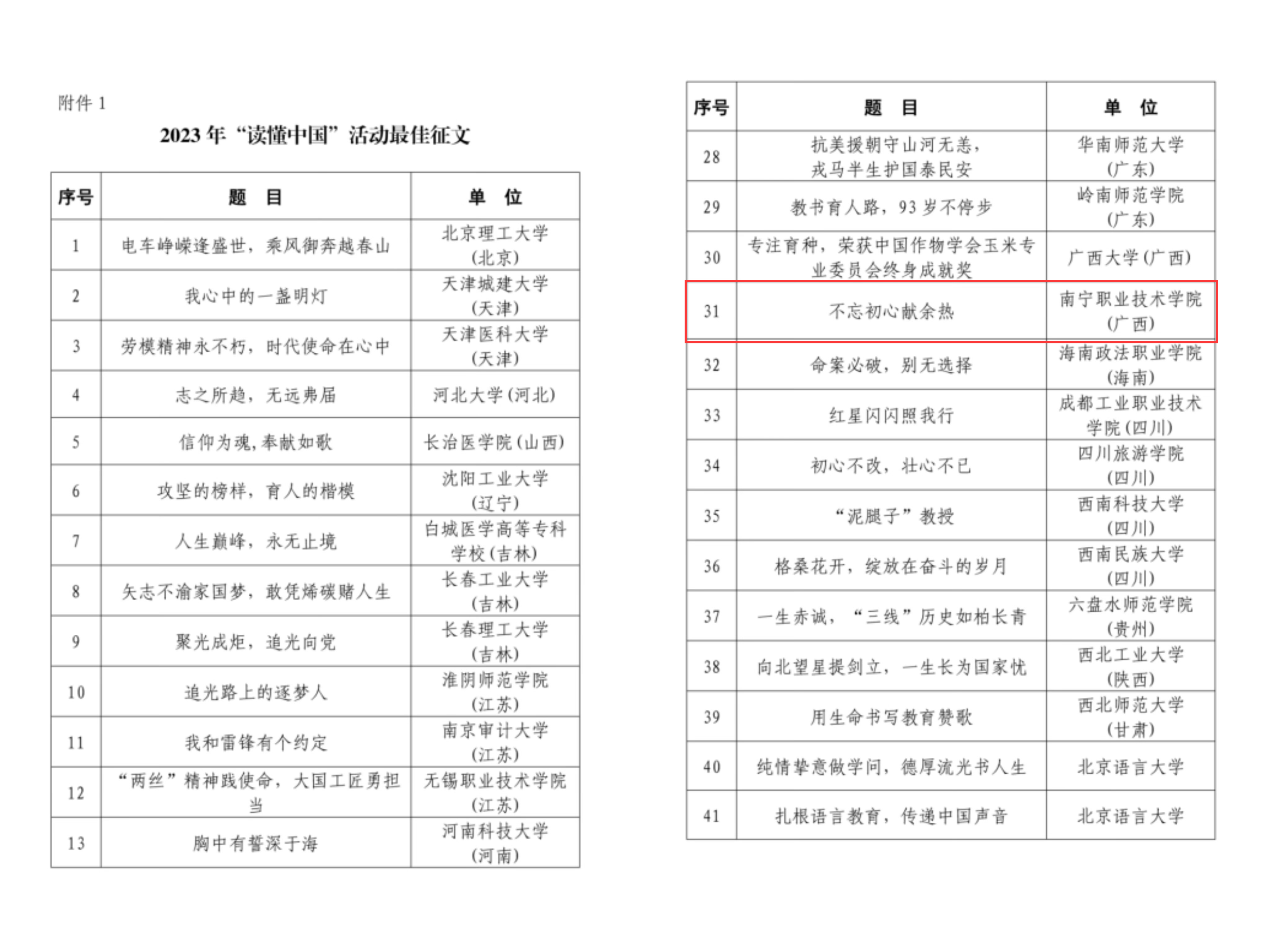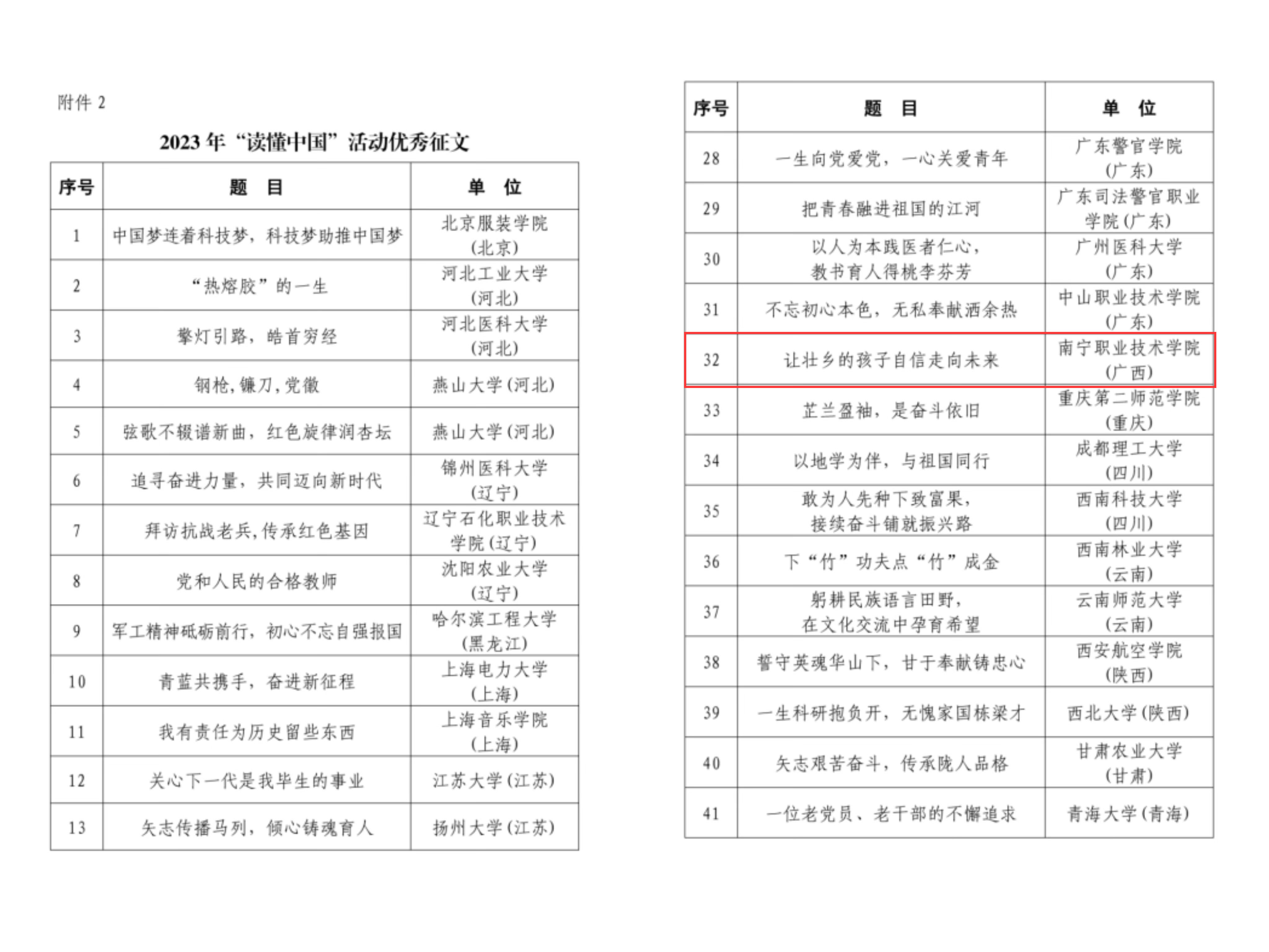 近日,教育部关工委公布2023年“读懂中国”活动作品评选结果,学校选送的征文《不忘初心献余热》获得最佳征文,《让壮乡的孩子自信走向未来》获优秀征文,学校获评2023年“读懂中国”活动表扬单位。必赢官网获奖作品《不忘初心献余热》已由中国教育电视台录制完成,2024年2月23日在中国教育电视台展播。