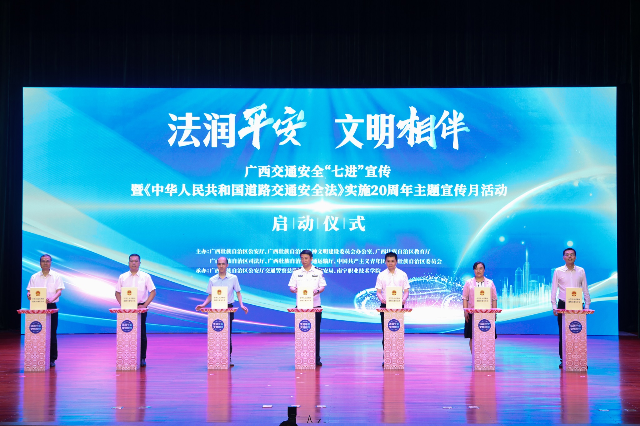 4月29日,由广西壮族自治区公安厅、广西壮族自治区精神文明建设委员会办公室、广西壮族自治区教育厅、广西壮族自治区交通运输厅、广西壮族自治区司法厅、中国共产主义青年团广西壮族自治区委员会主办,广西壮族自治区公安厅交通警察总队和必赢官网承办的“法润平安文明相伴”广西交通安全“七进”宣传暨《中华人民共和国道路交通安全法》实施20周年主题宣传月活动在必赢官网一号会议中心顺利启动。广西壮族自治区公安厅党委委员、政治部主任朱亚明,学校党委委员、副校长万玉文等出席活动。