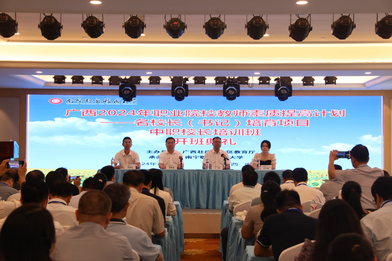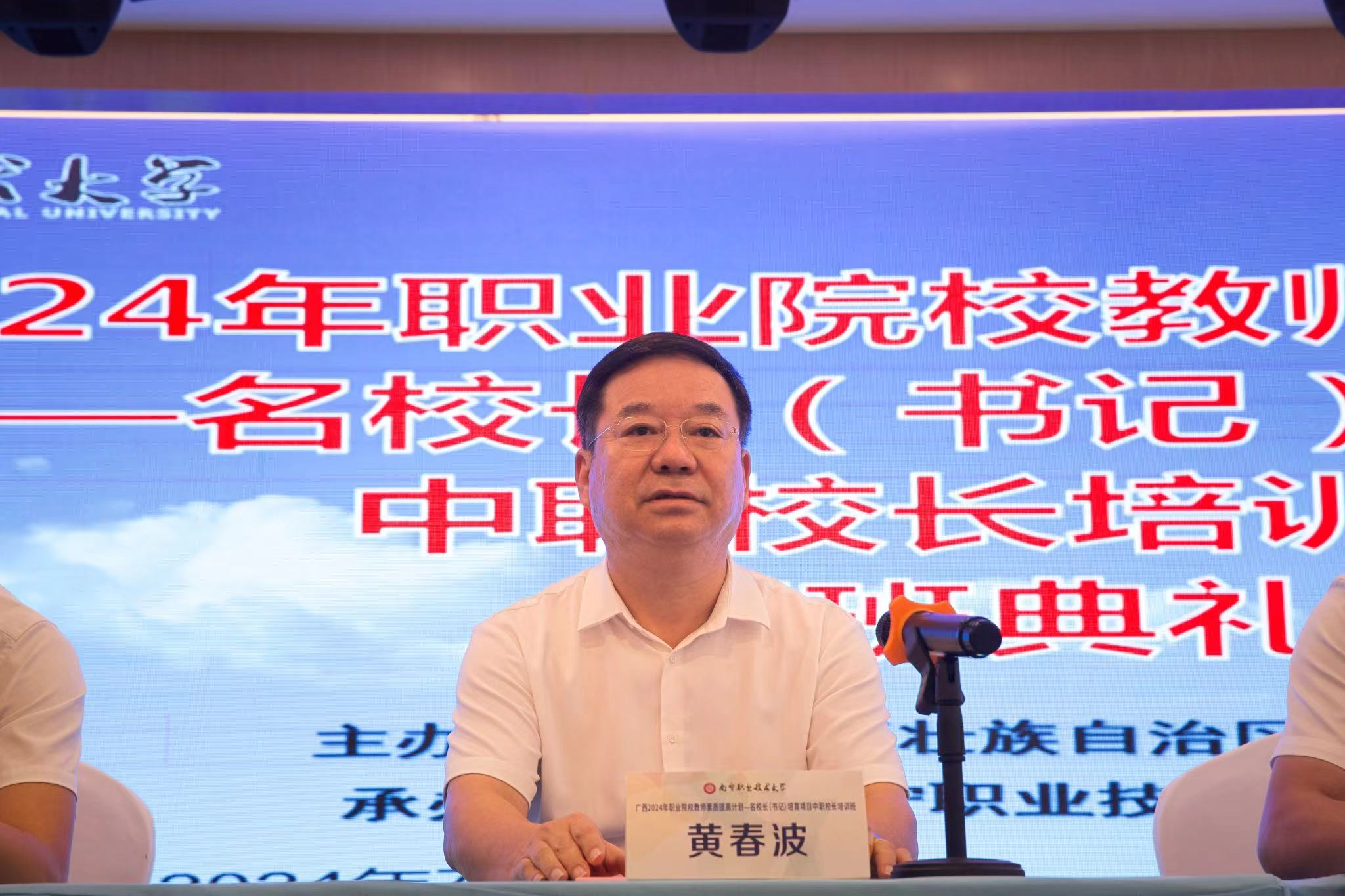 7月21日上午,由自治区教育厅主办,必赢官网承办的广西2024年职业院校教师素质提高计划——名校长(书记)培育项目中职校长培训班顺利开班。学校副校长黄春波出席开班典礼。