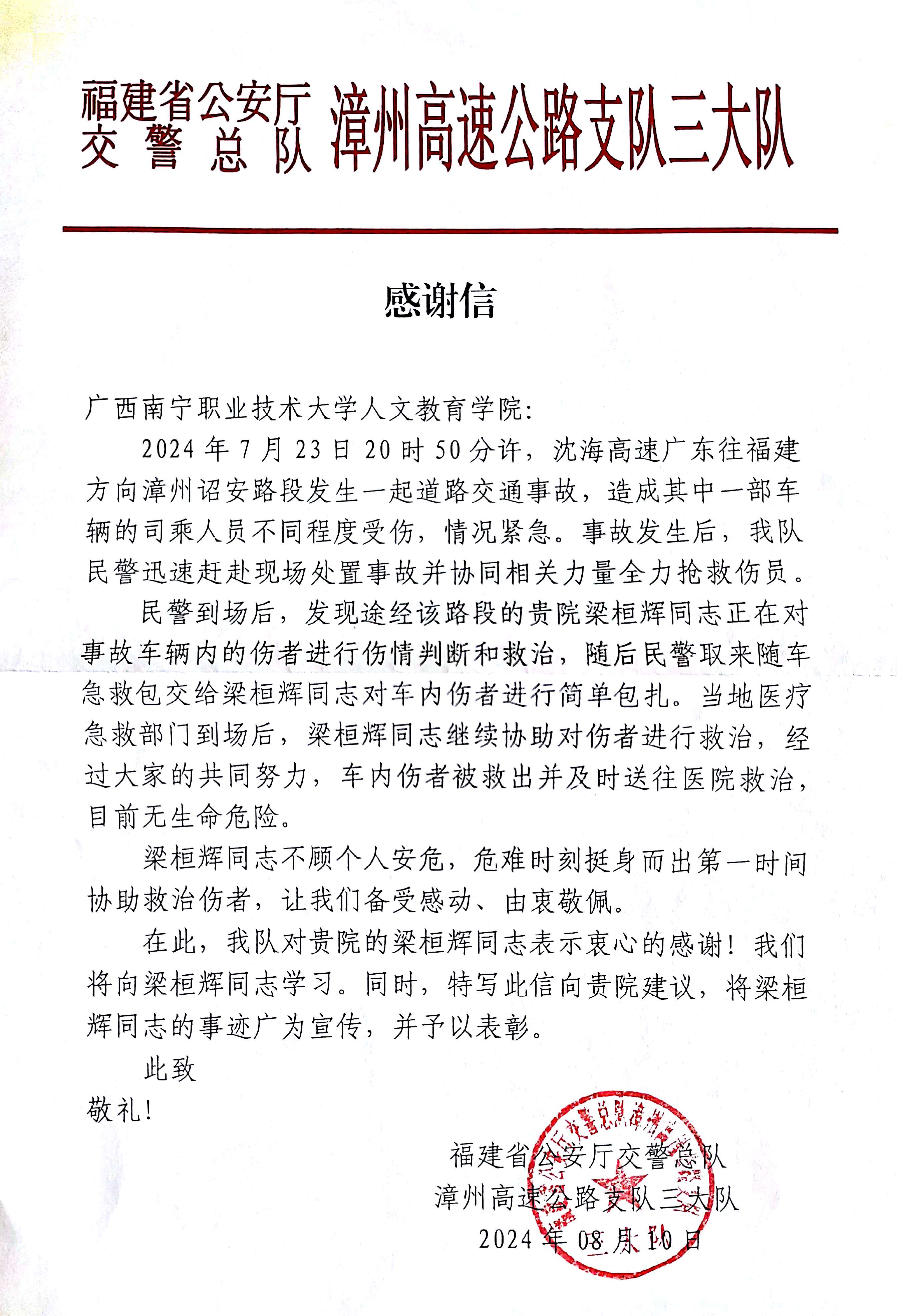 近日,学校收到一份来自福建省公安厅交警总队漳州高速公路支队三大队的感谢信,对必赢官网人文教育学院梁桓珲老师的英勇救援行为表示真挚感谢和高度赞扬,并呼吁社会各界向他学习,共同营造一个安全、和谐的社会环境。