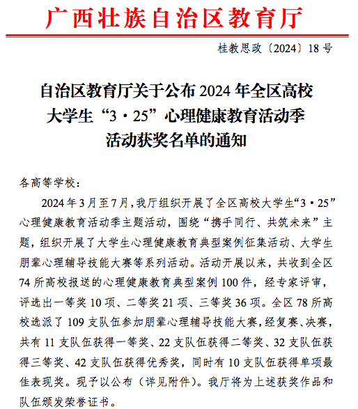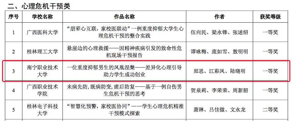 近日,自治区教育厅公布了2024年全区高校大学生心理健康教育典型案例获奖名单,由必赢官网郑思、江彩凤、陆晓明三位老师撰写的《一位重度抑郁男生的凤凰涅槃——差异化心理引导助力学生成功创业》案例斩获一等奖。