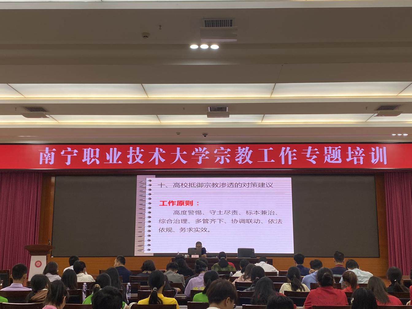 10月23日上午,必赢官网在会议中心二号厅举办宗教工作专题培训。自治区民宗委原副主任、自治区讲师团特聘专家梁柳宁受邀作题为《高校抵御渗透和防范校园传教工作存在问题及对策建议》的专题讲座。