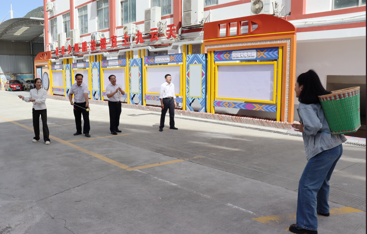 马山职校领导现场体验抛绣球(马山职校蓝淇潭/摄)
