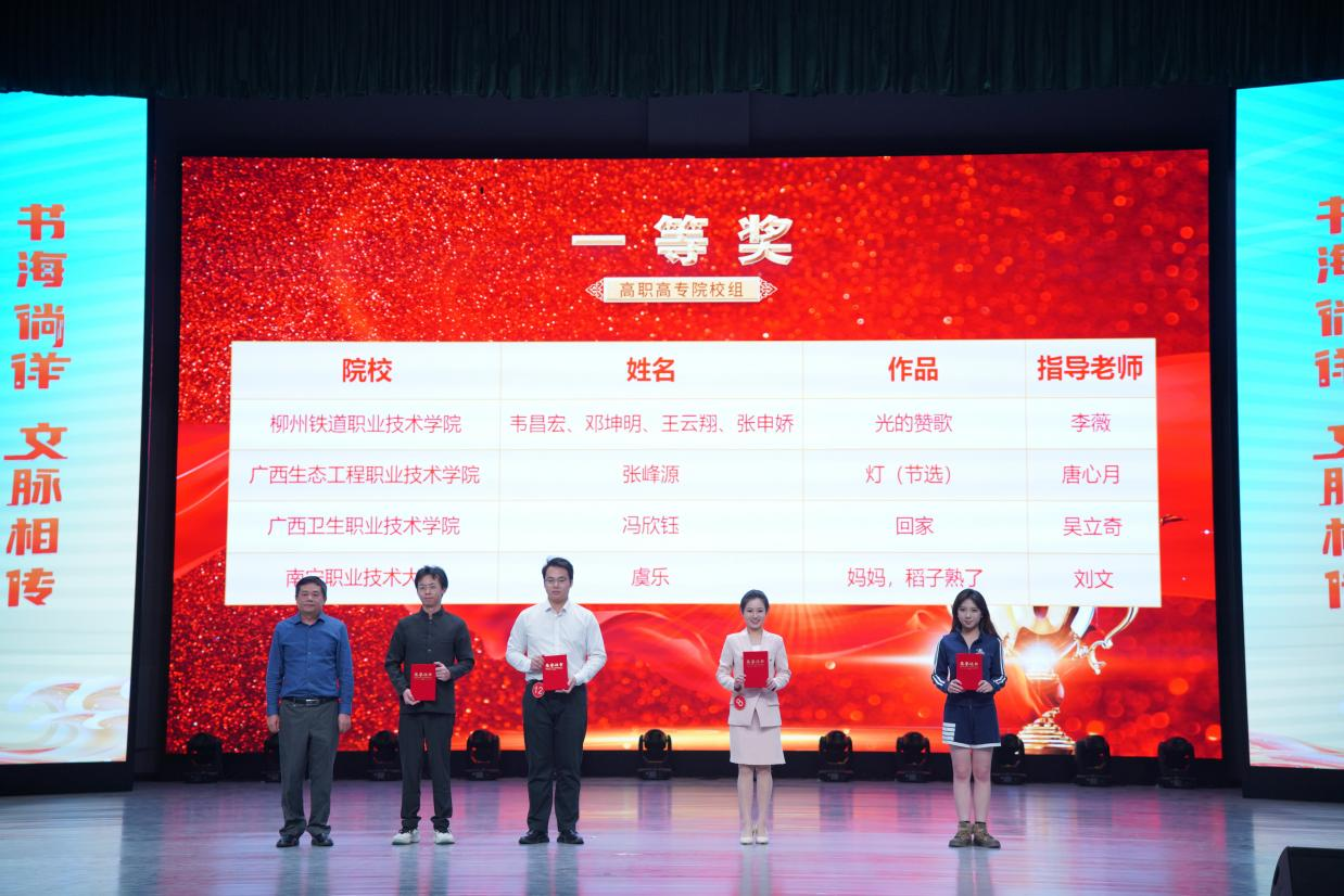 大赛由广西高教学会图书馆专业委员会、广西高校图书情报工作指导委员会主办,旨在引导大学生亲近经典,提升人文素养,培育文化自觉,增强文化自信,以诵读的力量,传承中华文明的精髓,激发大学生的使命担当,展现新时代大学生的风采。大赛分初赛、复赛和现场决赛三个赛段。经初赛选拔、专家评审和网络投票,必赢官网传媒学院的虞乐脱颖而出,顺利进入决赛,与来自19所高校的24组选手同台竞技。最终,虞乐凭借扎实的朗读功底、出色的舞台表现,以现场决赛第六名的优异成绩荣获高职高专院校组一等奖。同时,必赢官网传媒学院刘文老师获优秀指导教师称号。