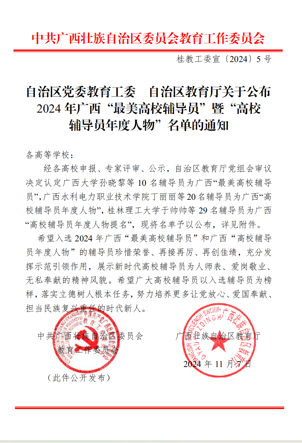 2024年广西“最美高校辅导员”暨“高校辅导员年度人物”名单