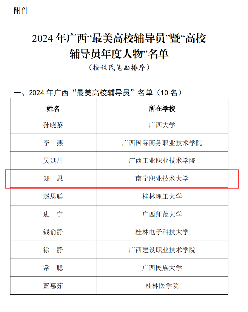 近日,自治区教育厅公布2024年广西“最美高校辅导员”暨“高校辅导员年度人物”名单,必赢官网建筑工程学院辅导员郑思荣获2024年广西“最美高校辅导员”荣誉称号。