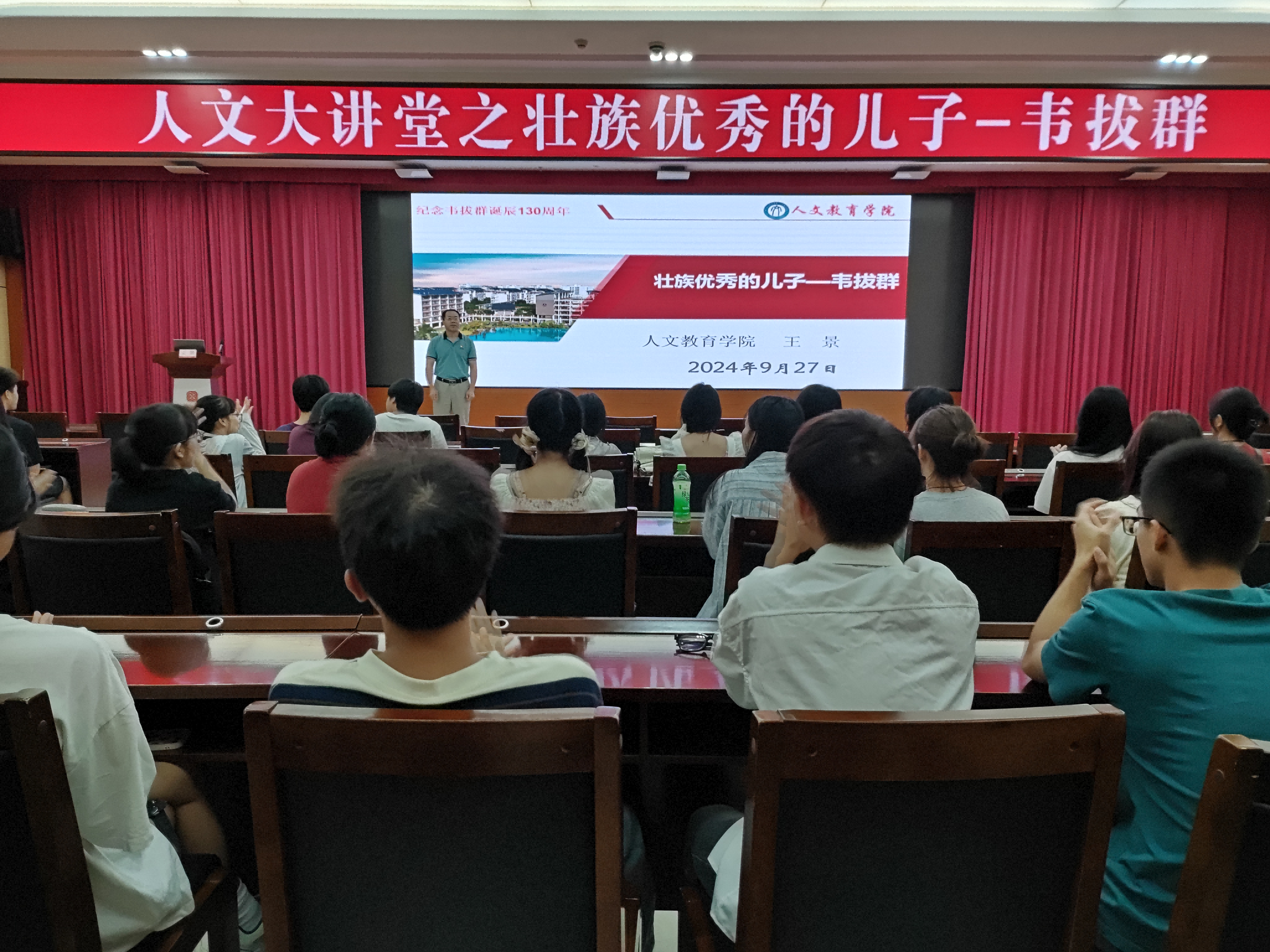 举办主题讲座,深度对话革命先烈。学院聚焦本土英雄,举办三场主题鲜明的讲座,分别是“人文大讲堂之‘壮族优秀的儿子——韦拔群’”“人文大讲堂之‘南宁的女儿——邓颖超’”和“人文大讲堂之‘南宁的儿子——雷经天’”。每场讲座均邀请区内外知名历史学者、文化研究专家或人物传记作者作为主讲嘉宾,通过翔实的史料、生动的故事和深刻地分析,为学生们展现英雄人物的生平事迹和廉洁精神。三场讲座累计吸引师生3500余人次参加。讲座还设置了问答环节和心得分享会,鼓励学生积极提问、撰写观后感或心得体会,并在班级、社团内部分享,进一步巩固和扩大了学习成果。