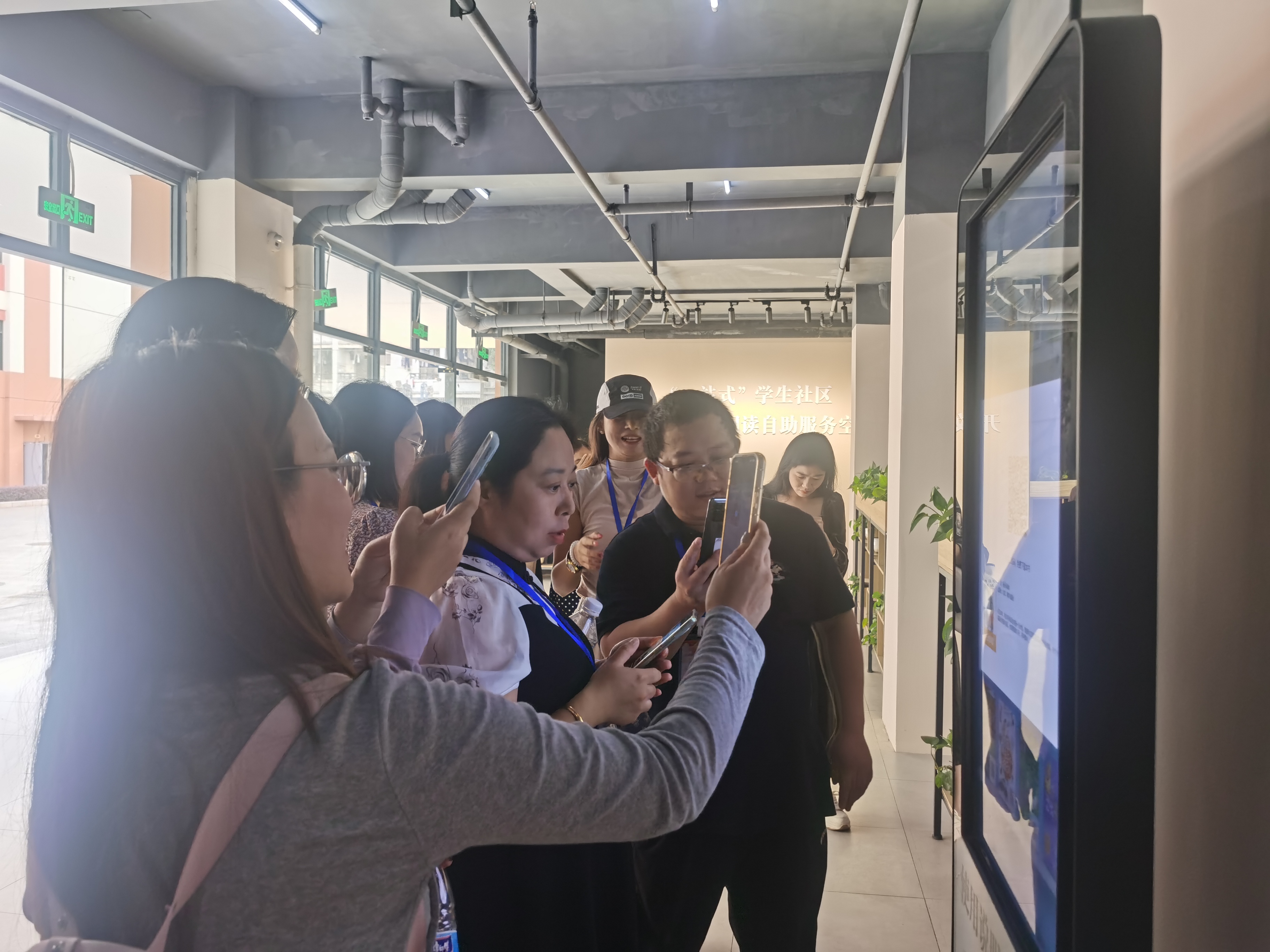 考察团先后参观了“湘约往事”辅导员工作室、大学生心理健康教育与咨询中心、19栋学生公寓“一站式”学生社区、大学生安全教育基地、“一站式”学生社区服务大厅等场所,并对19栋学生公寓“一站式”学生社区的开放式数字阅读自助服务空间表现出极大的兴趣,轮流翻阅浏览借阅机上的各类图书目录,还纷纷掏出手机扫码下载感兴趣的电子图书。