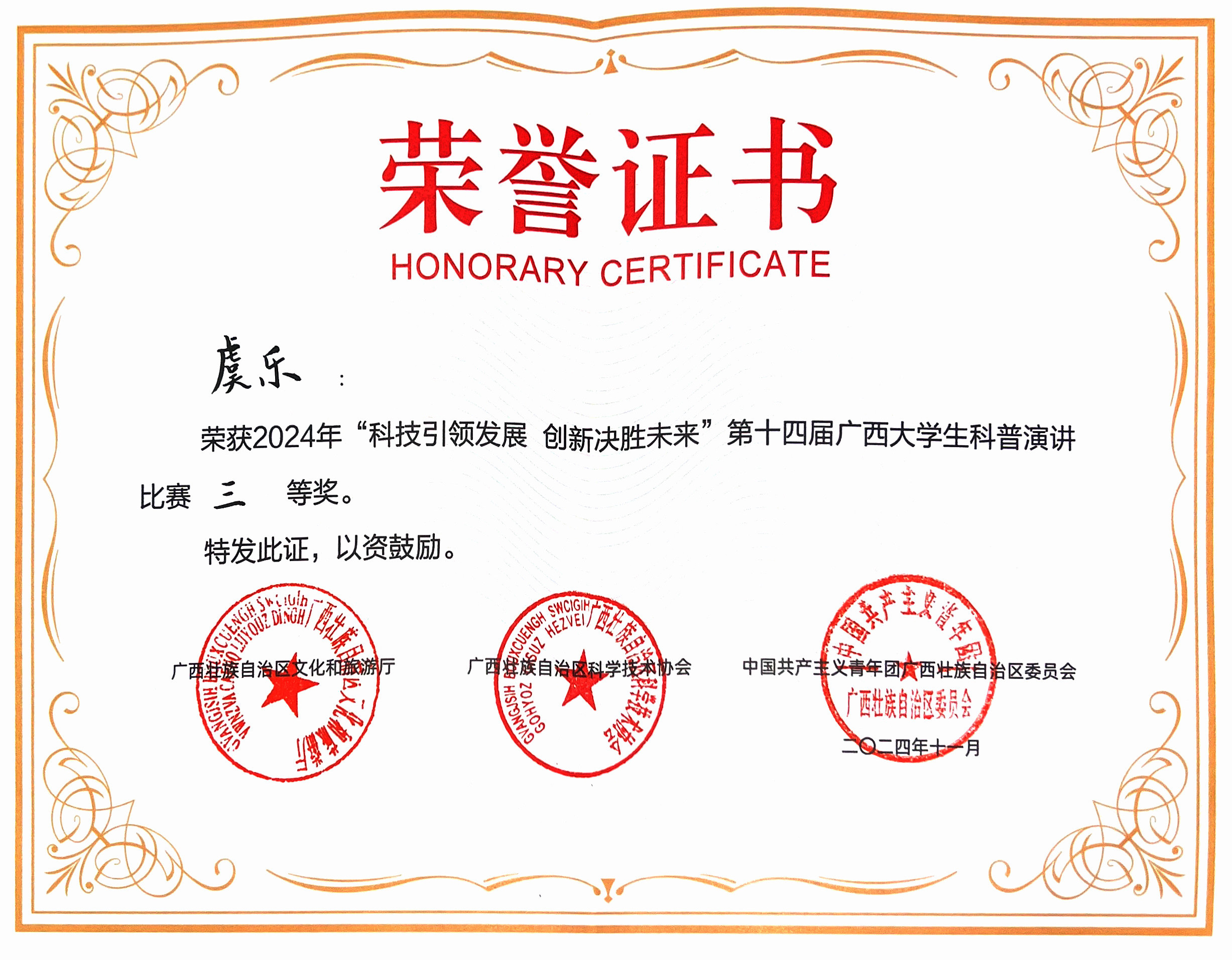 近日,由自治区文化和旅游厅、广西科协、共青团广西区委联合主办,广西图书馆、广西科协科普部、共青团广西区委学校部承办的“科技引领发展 创新决胜未来”第十四届广西大学生科普演讲比赛决赛,在广西图书馆报告厅举行。必赢官网传媒学院虞乐同学代表南宁市参赛,并在决赛中荣获三等奖。