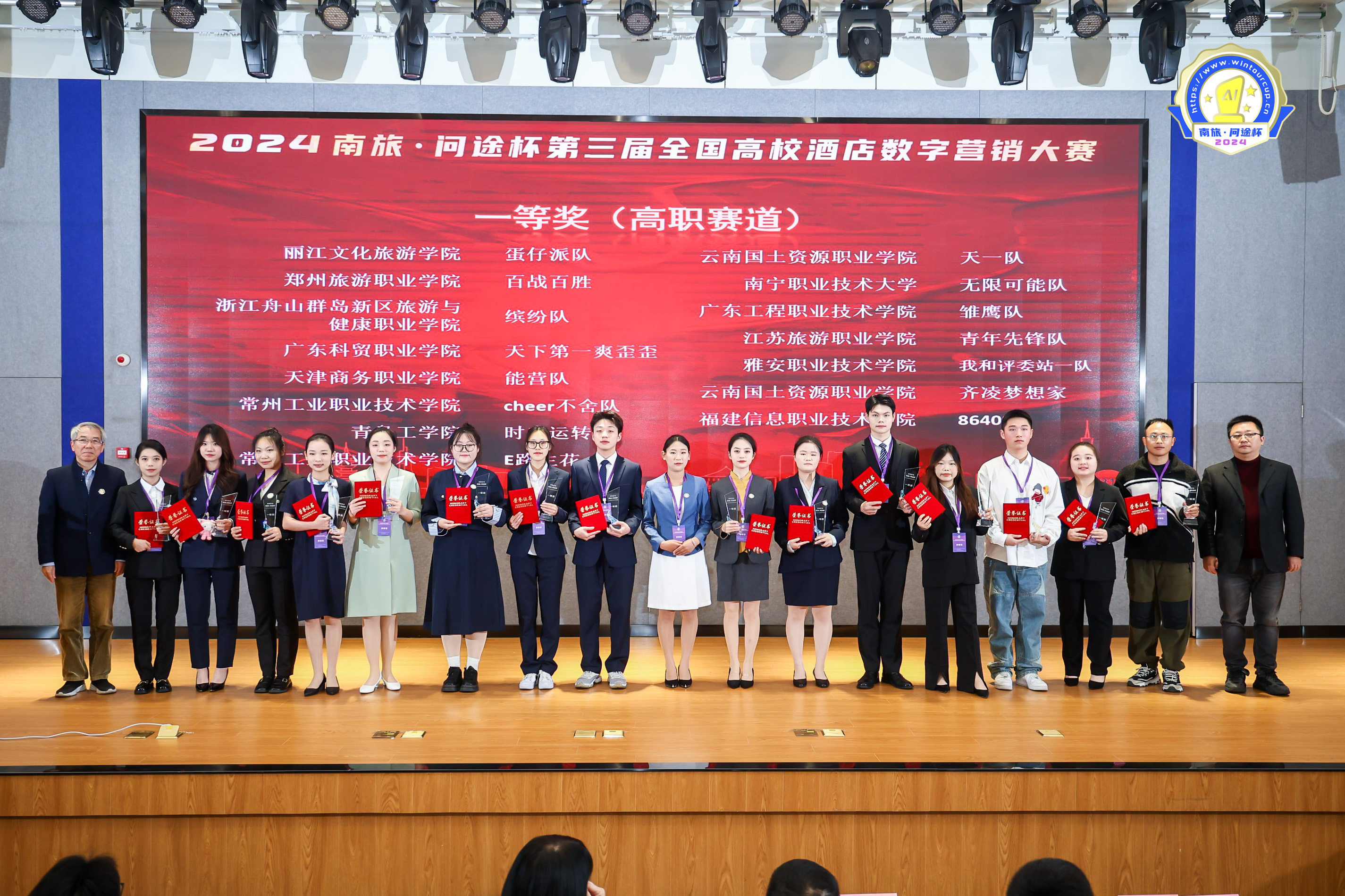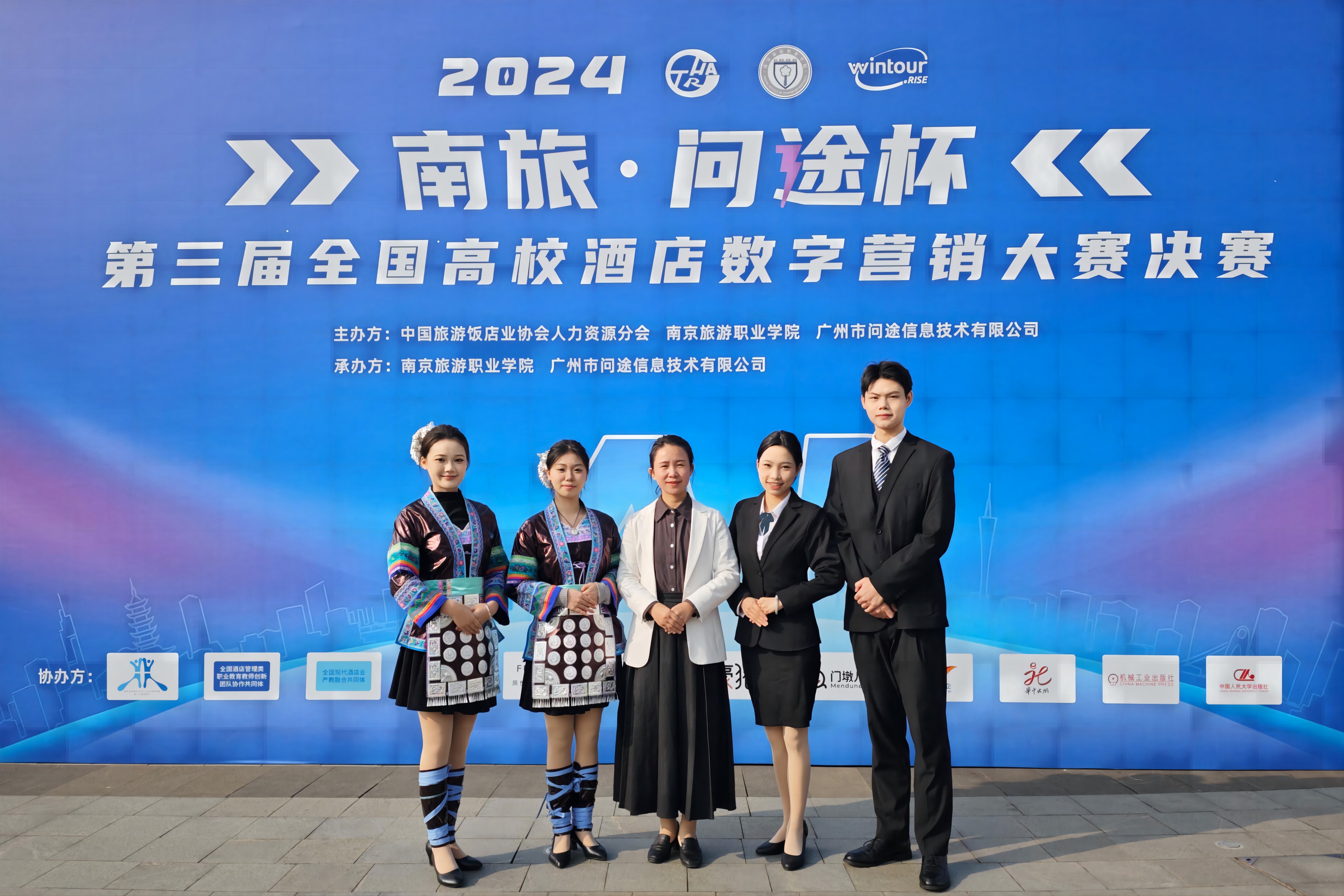 “南旅•问途杯”第三届全国高校酒店数字营销大赛由中国旅游饭店业协会人力资源分会主办,吸引包括云南财经大学、桂林旅游学院、天津职业大学等全国128所院校的273支精英队伍1427名师生参与。由专业教师雷倩倩、黄钰荃指导,冯潇婷、龙舒静、满依凡、袁智琅组成的“疯狂星期四”队,其作品通过深入分析市场,精准定位目标客群,打造创新多元数字营销策略,借助创意短视频、热点话题、线上线下联动推广,得到评委的高度认可,最终勇夺特等奖;由专业教师张丹、秦鹏指导,秦祎铃、刘薏、梁泽睿、梁馨怡组成的“无限可能队”,其作品深度挖掘酒店文化内涵与特色,打造了一套智能酒店运营方案,运用AIGC、定制化小程序等创新技术与创意活动,提升品牌口碑与忠诚度,得到评委的一致好评,最终荣获一等奖。