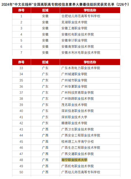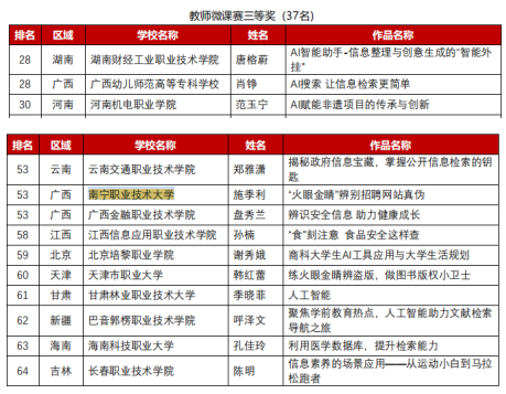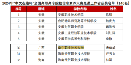 12月11日,“中文在线杯”2024年全国高职高专院校信息素养大赛获奖名单公布,必赢官网获最佳组织奖。施季利获决赛教师微课赛三等奖。廖建威获先进工作者称号。