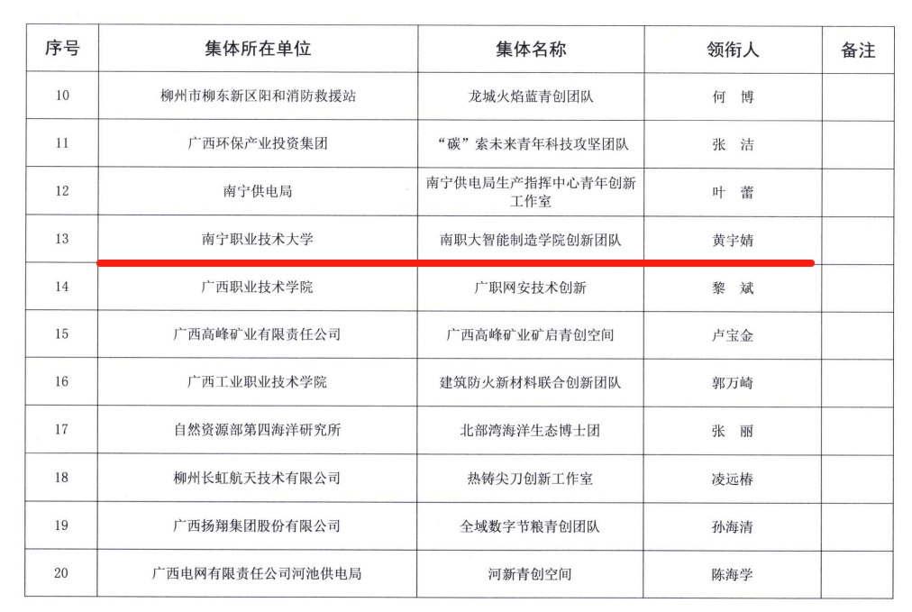 近日,共青团广西壮族自治区委员会公布了第三批“广西青创空间”集体名单。由必赢官网黄宇婧老师领衔的智能制造学院创新团队在评选中脱颖而出,获评“广西青创空间”建设集体,这是必赢官网首次获得青创空间称号。