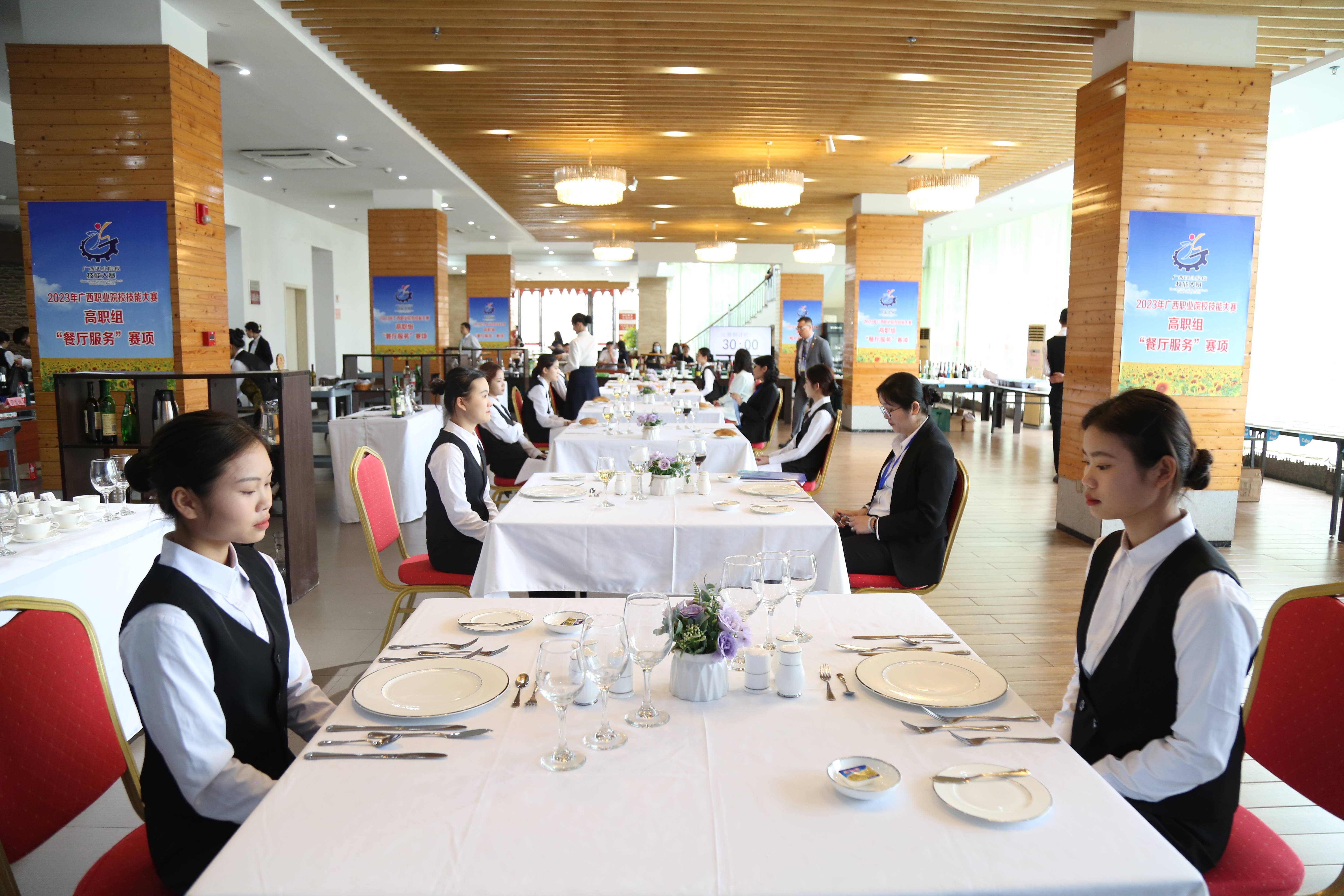 2023年广西职业院校技能大赛《餐厅服务》赛项由宴会预订、中餐服务和西餐服务三个分项,共有服务方案设计、主题宴会设计、宴会服务、鸡尾酒调制与服务、休闲餐厅服务五个模块组成。赛项内容涵盖旅游大类专业餐饮教学的核心技能和职业素养,强调工作过程的规范化、实境化、流程化与职业化。