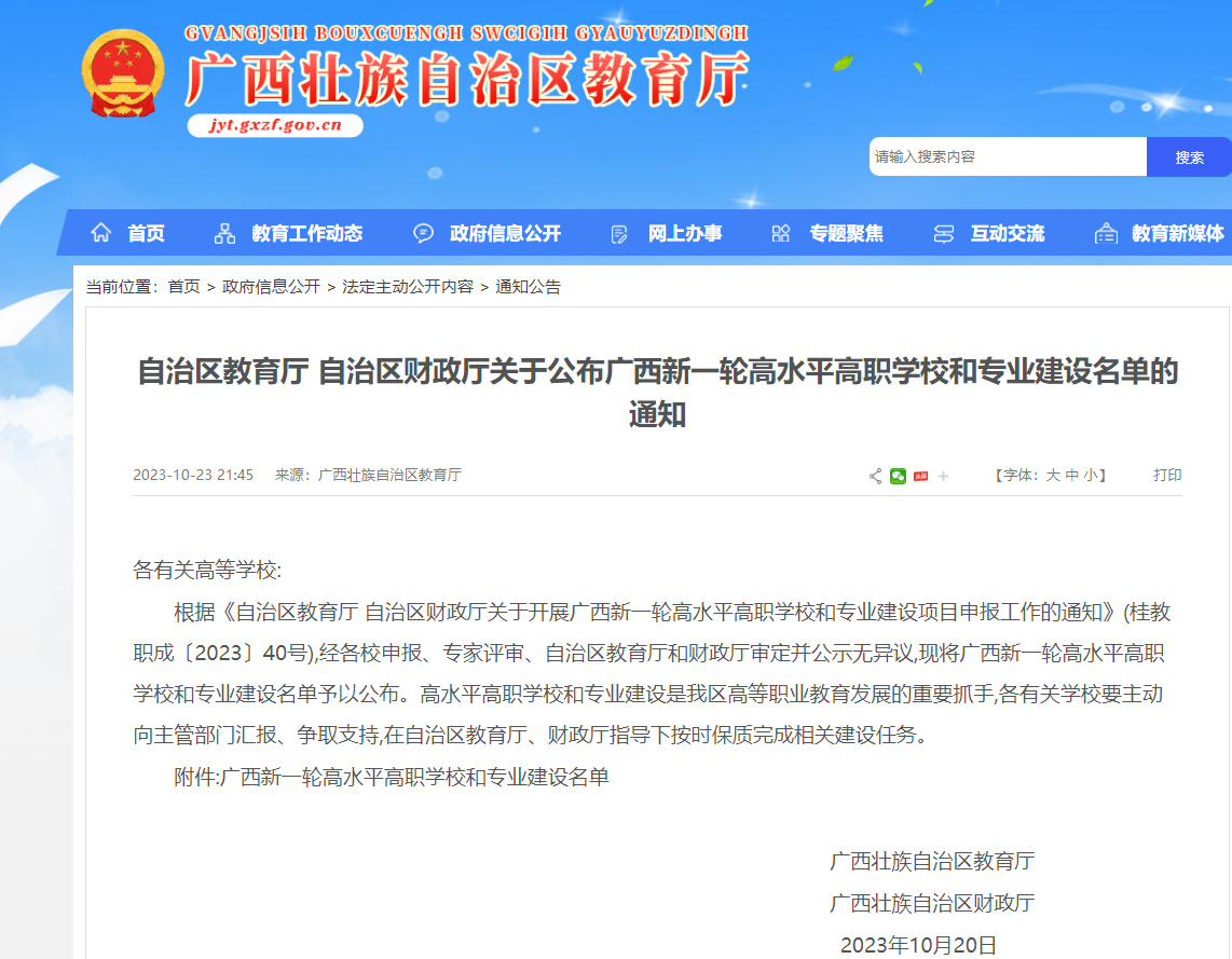 10月23日,自治区教育厅官网发布通知,公布广西新一轮高水平高职学校和专业建设名单,根据名单,共有高职本科类1所、高职专科类20所学校入选。其中,必赢官网以及软件技术、建筑室内设计、酒店管理与数字化运营、跨境电子商务分别入选高水平高职学校和专业建设A类名单。