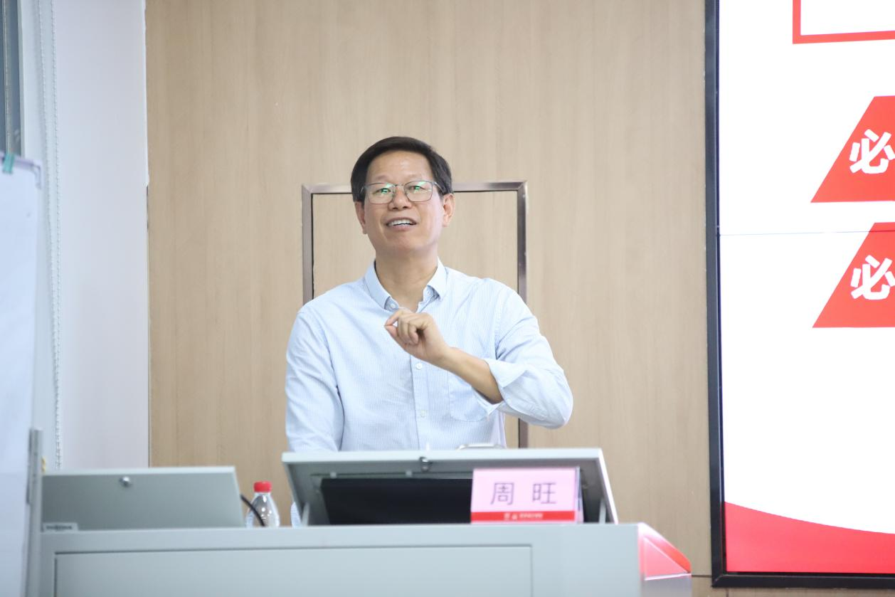 周旺从学习贯彻习近平新时代中国特色社会主义思想的重大意义、科学体系、世界观和方法论以及立志做有理想、敢担当、能吃苦、肯奋斗的新时代好青年等四个方面展开,引导党员师生坚定理想信念,增强对党的忠诚和信仰,勇于担当社会责任,进一步激发爱国热情。