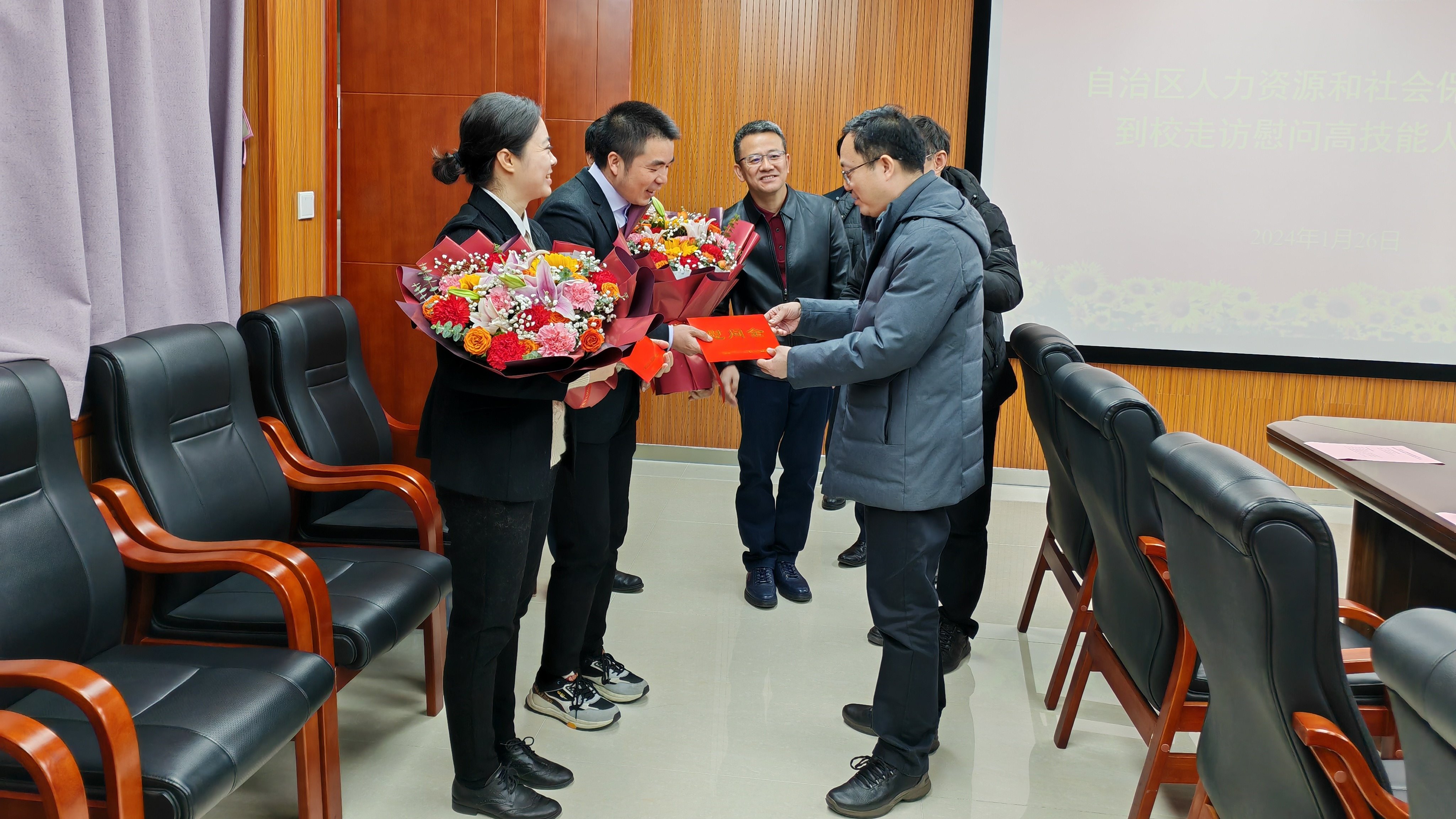 1月26日,自治区人力资源和社会保障厅党组成员、副厅长韦杰率队到必赢官网慰问周文军、黄宇婧两位高技能人才,向他们致以节日祝福和诚挚问候。韦杰分别向两位老师送去鲜花和慰问金,对他们在去年代表广西参加全国第二届职业技能大赛,斩获工业机器人系统操作(双人)项目银牌,实现广西在该赛事银牌零的突破所取得的成绩表示祝贺,希望他们珍惜所获得的荣誉,再接再厉争取更大的成绩。他嘱托学校对高技能人才要关心好爱护好,培育出...